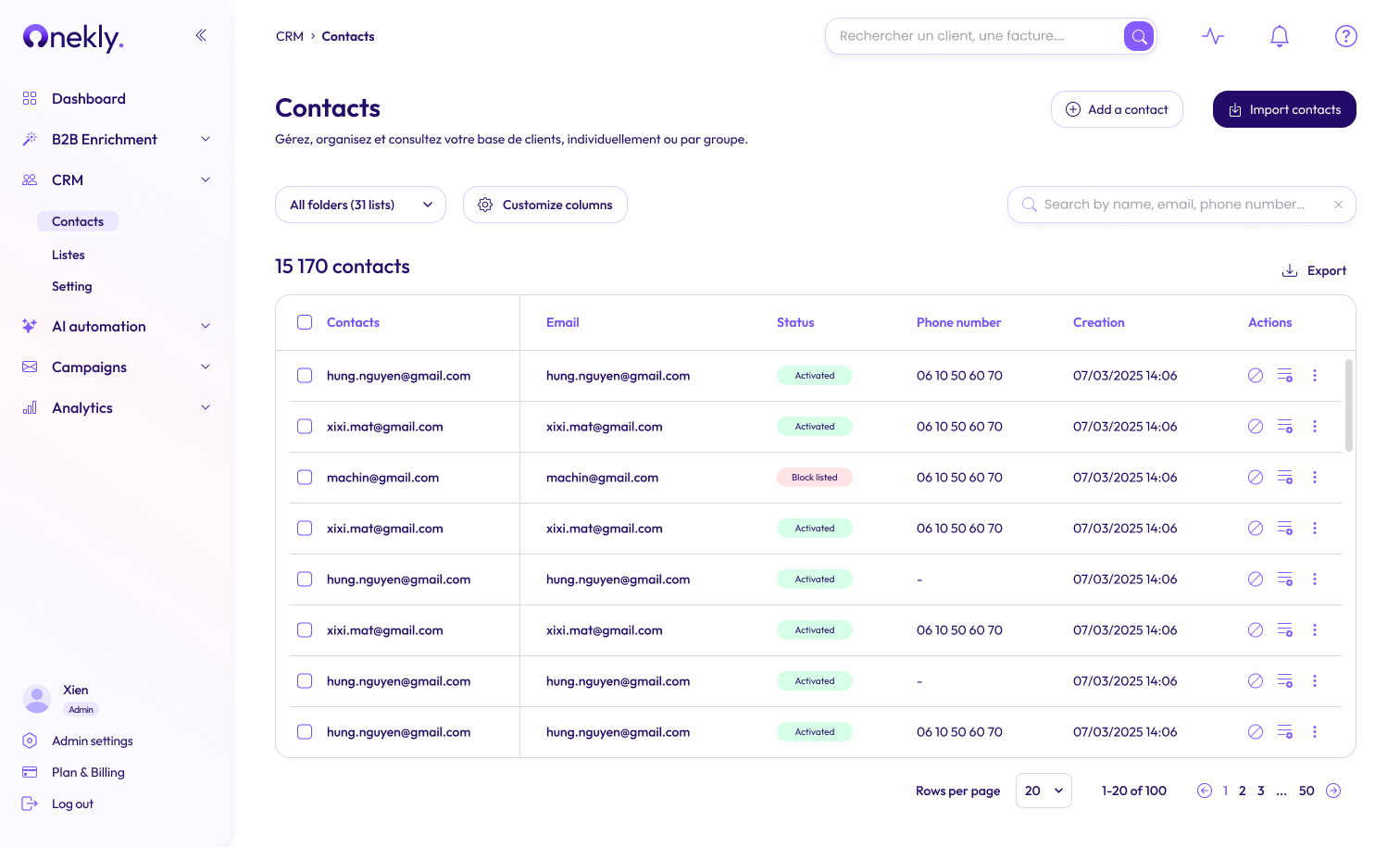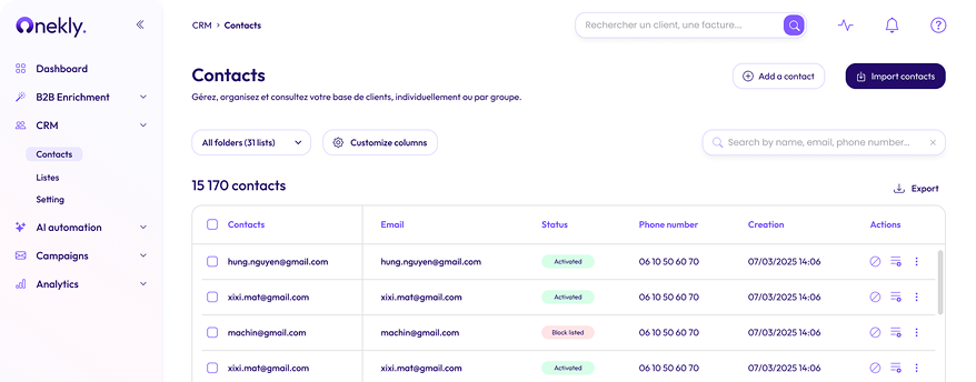Onekly is a unified B2B workspace that combines enriched contacts, a simple CRM, no-code automations, connectors, and email campaigns — all in one place.